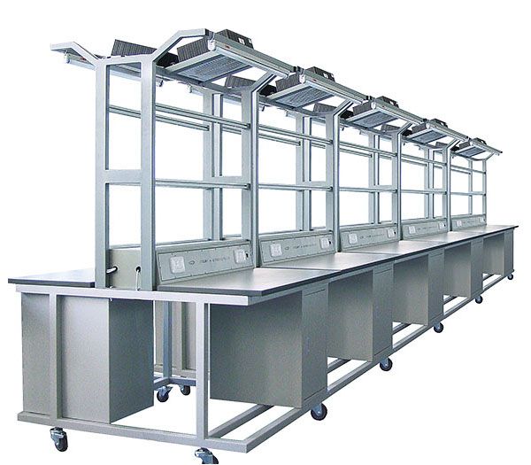 This platform provides 20 stations, and each station is equipped with fluorescent lighting, technology signage (used to put the data folder), dashboard, sockets, tool cabinets, training circuit board, training tools (digital multimeter, component box, electric soldering iron, scissor, wire stripper, screwdriver, etc.). Students can complete simulation training of production process