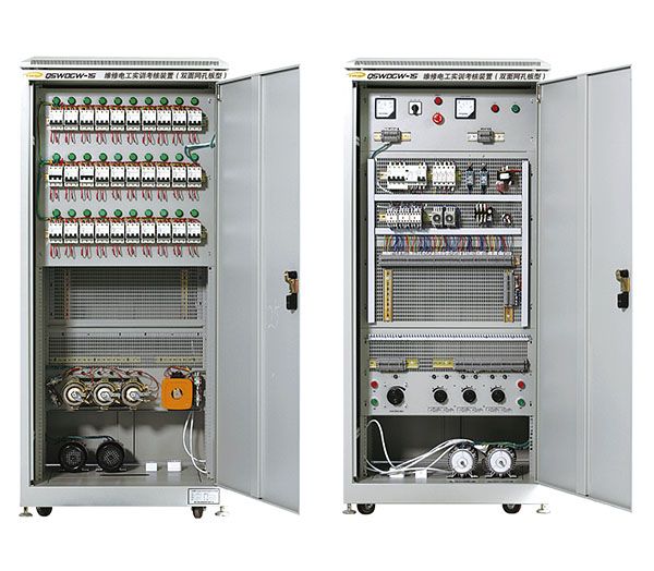 該裝置采用標準立柜為主體柜,充分利用該柜單面空間位置,其中裝有電源控制、交直流電源、測量儀表,低壓電氣模塊、網(wǎng)孔板,配有多種實訓模塊,可以直接掛在網(wǎng)孔板上,搭配方便靈活,具有可擴展性。